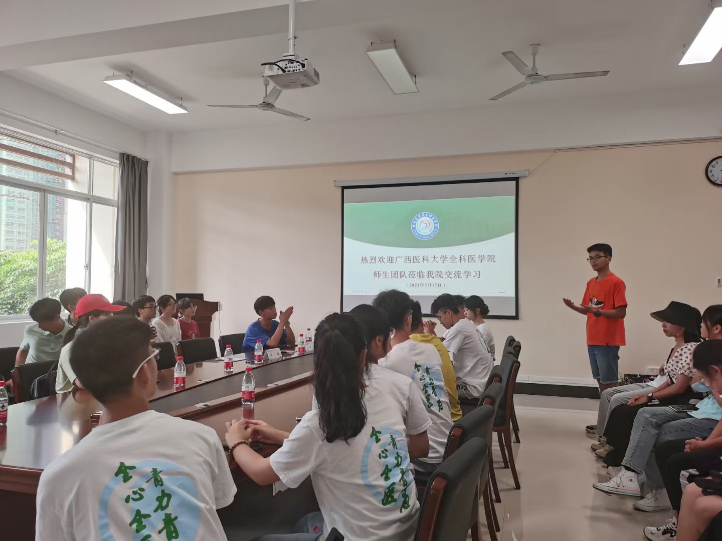 7月17日下午,广西医科大全科医学院学生科主任、团委书记于佳及辅导员龙飞飞师生团队一行23人赴我校全科医学院开展参观交流。我校全科医学院党委副书记潘涛、团委书记陈辰、辅导员张健铭带领全科医学院学生们热情接待。此后,两学院的医学团队将联合赴恭城,开展为期三天的义诊、调研活动。