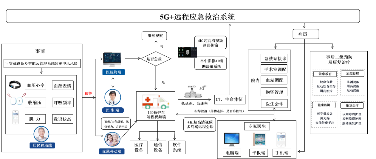 本项目脑卒中5G+远程应急救治系统一体多用(预防、应急、康复管理),平台搭建按照事前、事中、事后业务顺序进行搭建,集合近20项功能,保证一个系统适应四大应用场景。事前通过可穿戴设备,以人工智能AI识别中风前兆等技术为基础,建立大数据智能云平台管理系统。事中建立5G移动卒中单元,利用5G高速率、低时延、大连接的特性,将急救的部分工作前移,实现“上车即入院”,抢占黄金时间救治,降低患者致死致残率。同时,通过5G +移动便携式远程会诊设备深入基层社区或边远地区的常态化巡诊与高危筛查、体检,对高危群体开展一级、二级预防,对普通群众的健康教育与科普应用。事后进一步二级预防及积极康复,在云计算和人工智能神经网络算法的基础上,建立脑卒中患者的慢病行为智能分析技术,及时发现高危因素(抽烟,饮酒,肥胖等)、并整合统计学于算法中,为患者提供自我干预方案和有效的康复训练方案,并实现脑卒中患者健康图谱。
