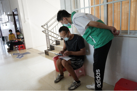 学生志愿者在耐心地帮助居民进行接种疫苗前的信息登记