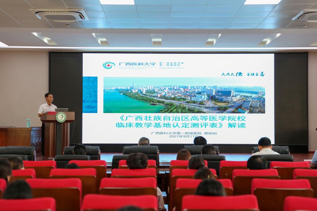 9月11日上午,在9号楼3楼多功能报告厅,临桂临床医学院(第二附属医院)召开 “高等医学院校A级教学医院”(以下简称“A级教学医院”) 基地评审标准解读暨培训会议。临桂临床医学院(第二附属医院)党委书记文琼仙,党委副书记、纪委书记王群,副院长王海鹏出席此次会议,参会人员有全体教研室主任、副主任、教学秘书,临床医技科室主任、护士长及相关职能部门人员,会议由教学管理部负责人主持。