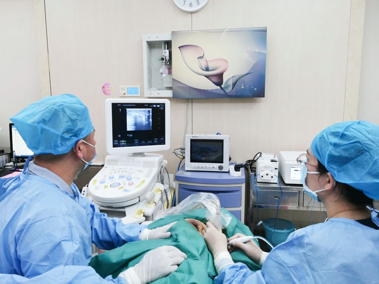 术后第4天在介入超声专家洪运虎教授指导下,由刚从解放军总医院进修回来的黄仁相主治医生行超声引导下双侧乳腺多发肿瘤射频消融术。