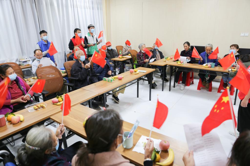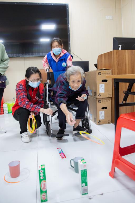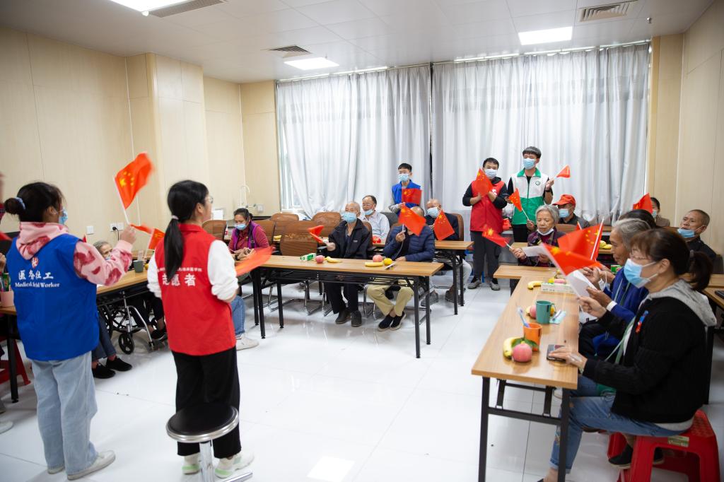 活动伊始,医务社工、学生志愿者与老人们相互认识、亲切交流。伴随着优美而舒缓的音乐,志愿者们带领老人们做手指操,帮助老人训练手脑协调、放松身体。接下来,志愿者们为老人准备了套圈游戏,游戏氛围活跃。老人们通过简单的游戏赢得了实用的生活用品,同时也收获了祝福与关心。然后进入分享环节,现场的老人们分享自己的经历,让大家感受到作为一名中国人的骄傲和幸福。最后,全体成员一起合唱《没有共产党就没有新中国》。
