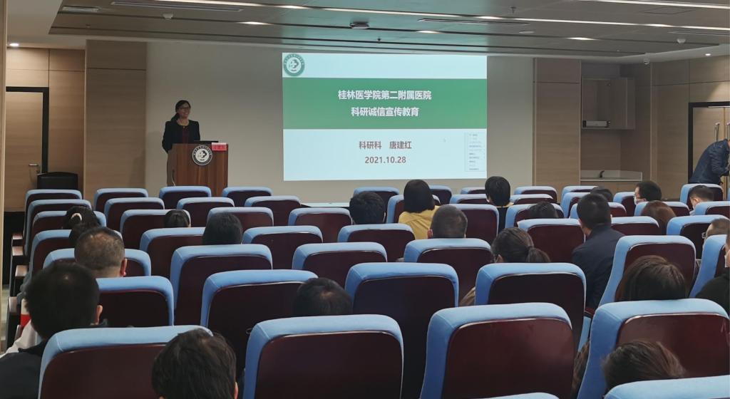 为深入贯彻、落实国家卫健委和教育部、自治区卫健委和教育厅以及学校“关于医学科研诚信与作风学风建设专项教育整治活动的通知”精神和工作部署,进一步加强医院科研诚信体系建设,规范医学科研行为,10月28日下午,在PET-CT楼五楼会议室,第二附属医院召开了科研诚信作风学风建设教育宣讲会,科研项目负责人及项目组成员近200人参加了本次会议,会议由科研科科长唐建红主持并任宣讲人。