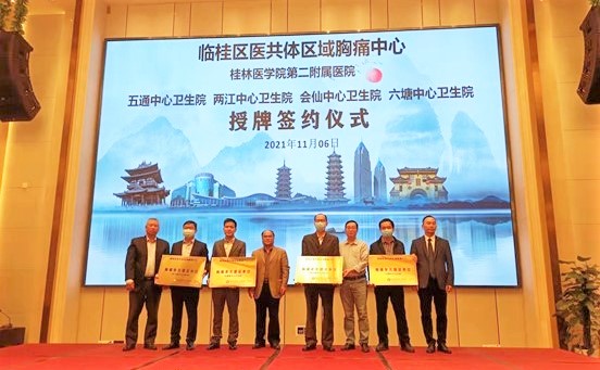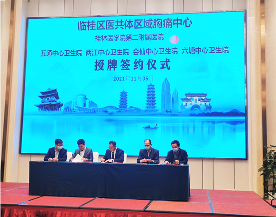 随后,医共体总院与六塘、会仙、两江、五通四家分院成功签订胸痛救治单元合作协议并授牌。
