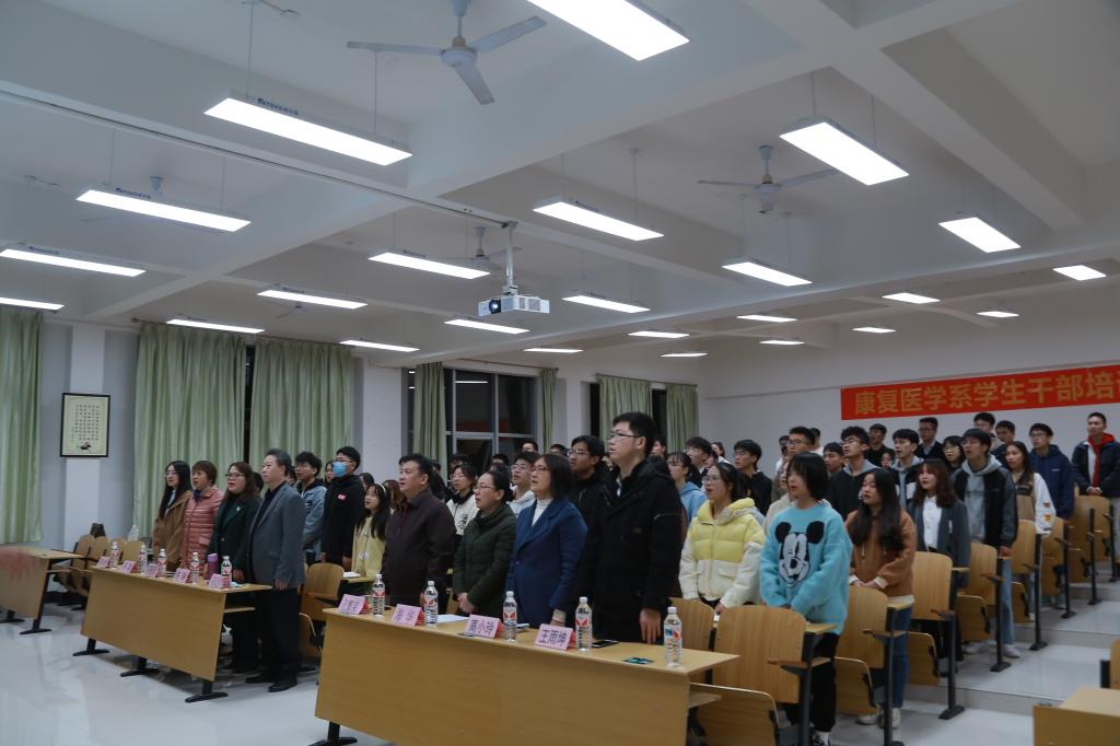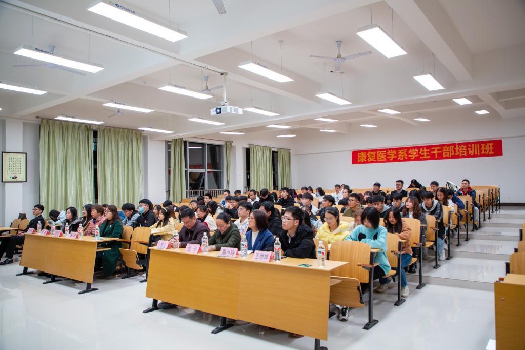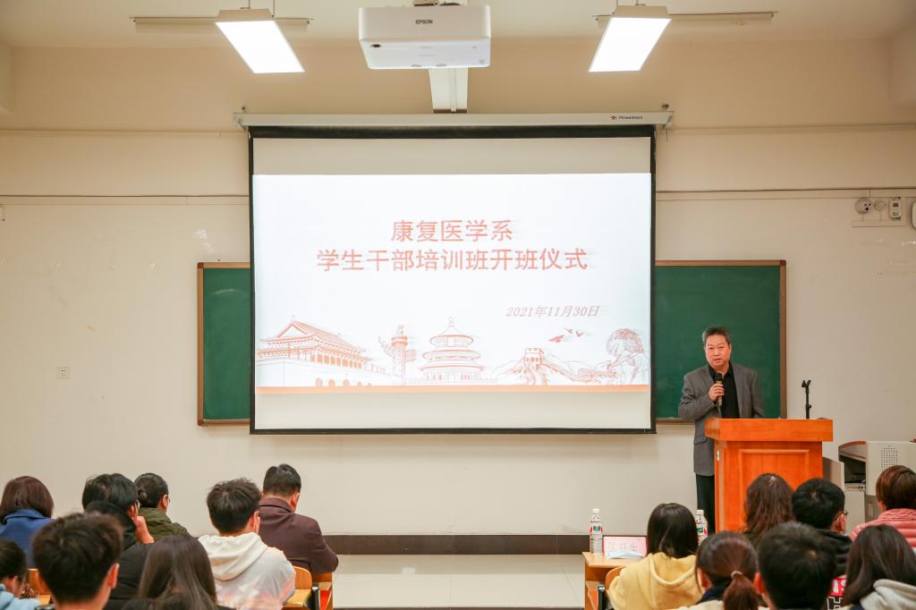 为提高学生干部组织管理能力,增强学生干部服务意识和责任意识,提升学生干部政治素养,康复医学系于近期开设学生干部培训班。11月30日晚,开班仪式在临桂校区教学北楼202教室举行。康复医学系主任陈廷生致辞并讲授开班“第一课”。系副主任许玲、孔繁荣,系办公室、教学科研管理科、学生工作办公室负责人及相关人员,班级导师李鑫博士、班主任苏冰倩、王雨坤老师,以及各班学生干部共近百人参加开班仪式。