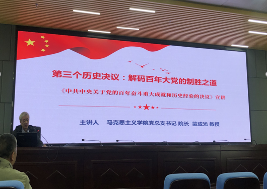 蒙成光以“第三个历史决议:解码百年大党的制胜之道─中共中央关于党的百年奋斗重大成就和历史经验的决议”为主题,围绕党的历史关头的三个历史决议,对党的十九届六中全会精神进行了深入解读。报告主题鲜明、内容丰富,思想深刻、深入浅出,逻辑严密、条理清楚,对于全面理解和把握党的十九届六中全会精神,抓好学习贯彻落实工作具有积极的指导推动作用,是一堂学习宣传贯彻好全会精神的一次精彩辅导。