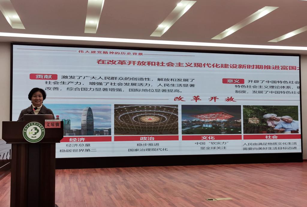 文琼仙以《学习党的十九届六中全会精神——弘扬建党精神,抢抓机遇,奋力推进医院高质量发展》为主题分别从“党的十九届六中全会精神要点”、“伟大建党精神产生的历史背景”、“伟大建党精神的丰富内涵”等方面,对党的十九届六中全会精神的核心要义、精神实质、实践要求进行了深入解读和深刻阐释。