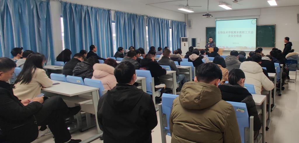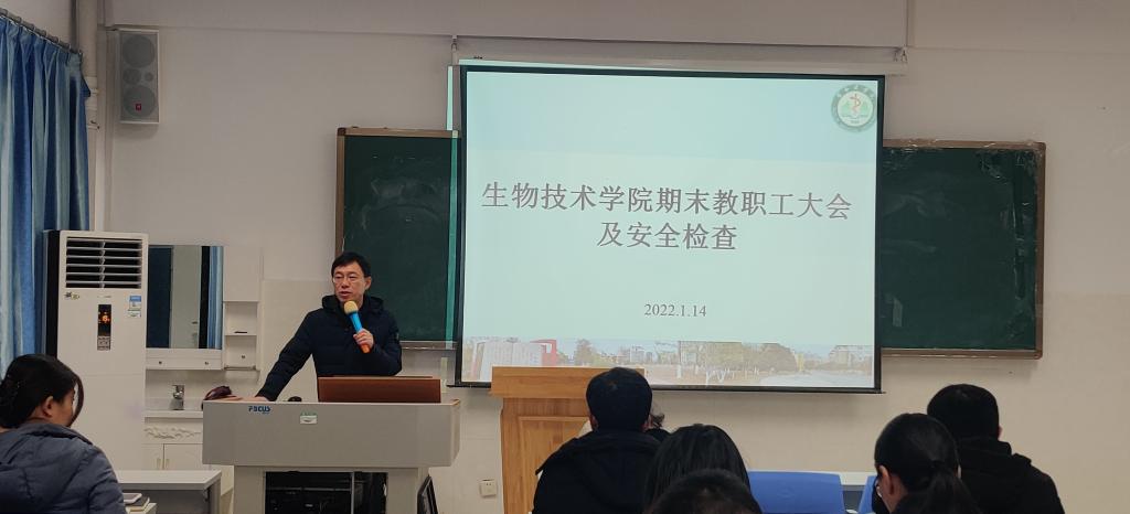 1月14日上午,生物技术学院在生技楼404教室召开期末教职工大会,学院党政领导、全体教职工参加了会议。学院院长孙立元主持大会。