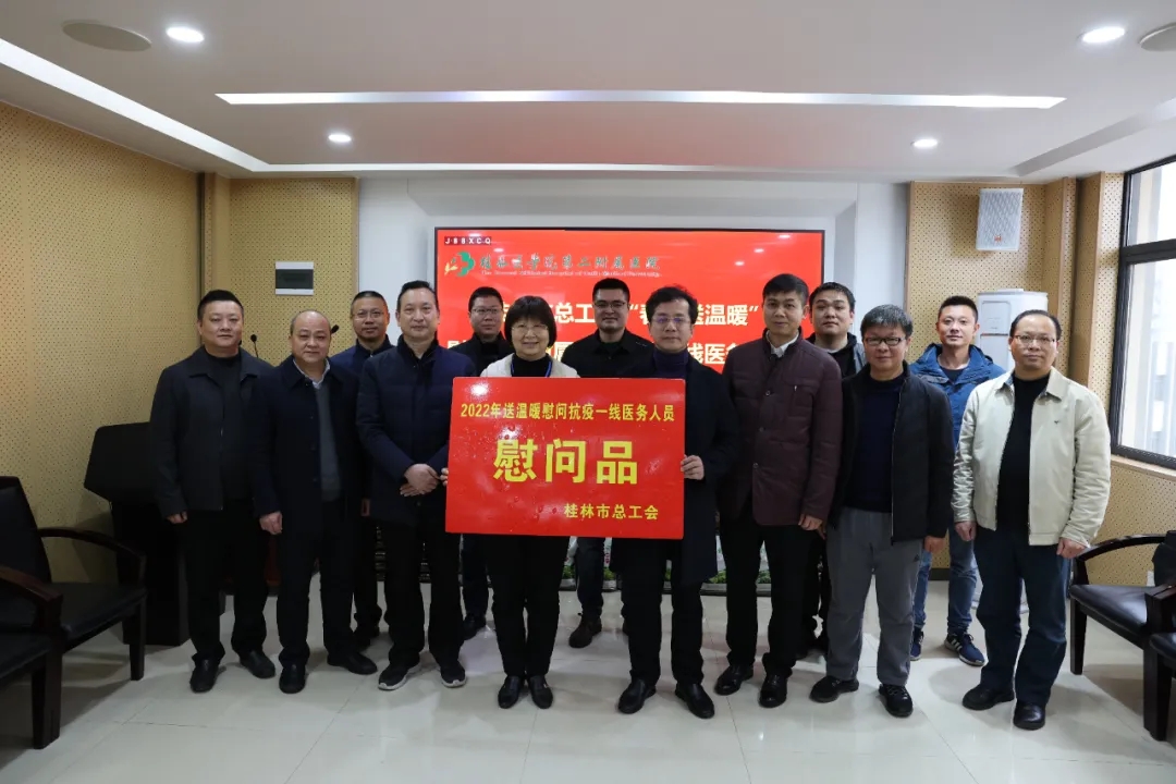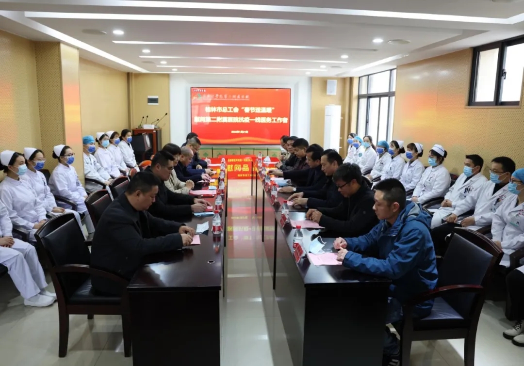 1月21日上午,桂林市总工会党组书记、常务副主席宁志,党组成员曹春新,临桂区人大常委会副主任、区总工会主席唐正红,临桂区总工会党组书记、副主席罗万魁一行7人到第二附属医院慰问奋战在抗疫一线的医务人员代表。院领导莫碧文、彭鹏、黄宇平、刘洪波、王海鹏、张海峰及20多名一线医务人员代表及相关职能科室负责人代表参加活动。