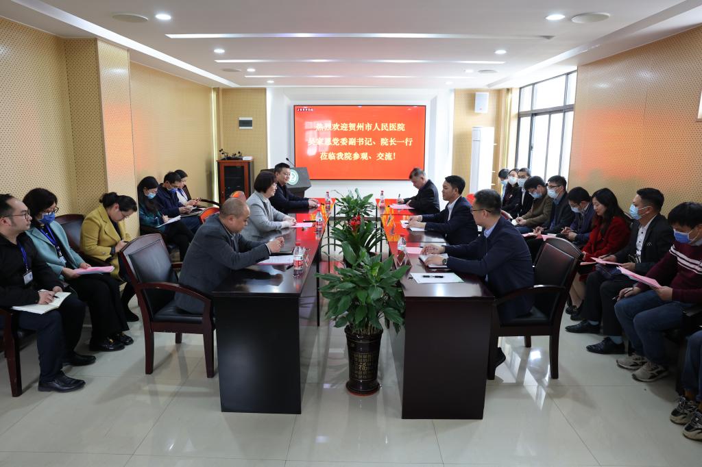 3月3日下午,贺州市人民医院院长吴家恩一行18人莅临第二附属医院,就创建广西高等医学院校A级教学医院工作经验进行交流学习,第二附属医院党委书记葛波,党委副书记、院长莫碧文,党委副书记、纪委书记彭鹏,副院长王海鹏及相关职能科室负责人与来宾进行了交流座谈。