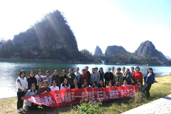 阳春三月,春意盎然。全体女教职工沐浴着和煦的阳光,兴高采烈地从东城校区门口出发,健步走到风光秀丽的漓江之畔,遥望叠彩山脚下的学校旧址。护理学院党委书记秦媛代表学院党政向默默奋战在工作第一线的女教职工表示节日的祝福和亲切的慰问。她带领全体女教职工一起追忆了桂林医学院87年的发展历程,回顾了一代代桂医人艰苦奋斗、潜心育人的感人事迹,赞扬了优秀校友立足岗位、建功立业的骄人成绩,围绕校训基本内容和丰富内涵,号召大家积极学习、不忘初心、牢记使命,践行“弘德善医”的校训精神,为学校实现跨越式发展贡献积极力量。最后,在清幽漓水畔和秀美叠彩山前,全体人员激情满怀唱响校歌,悠扬的歌声在山水间回响,表达了大家对学校的热爱、并将爱校之心外化为荣校之行的坚强决心。