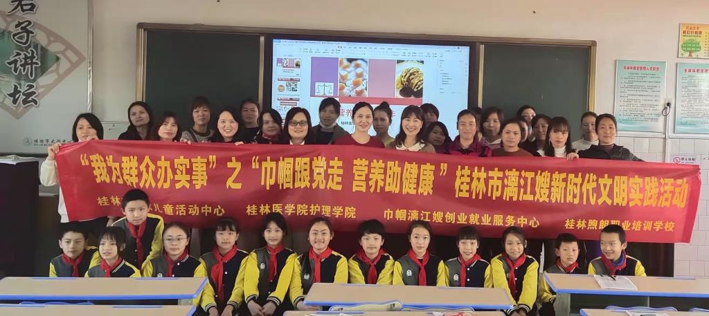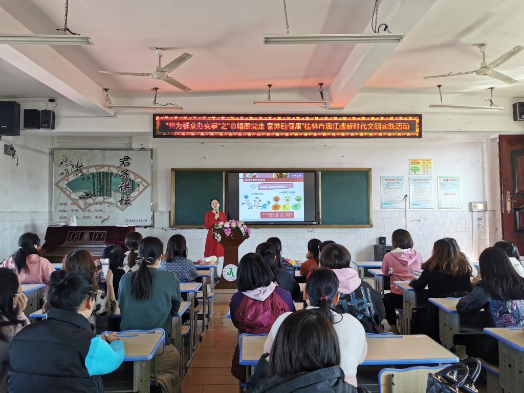 在三八妇女节来临之际,3月7日,由桂林市妇联主办、桂林医学院护理学院与巾帼漓江嫂创业就业服务中心等机构共同承办的“巾帼跟党走、营养助健康”公益活动分别在桂林市妇女儿童中心和大河乡中心校举办,据统计,有来自活动现场及线上200余人参加了活动。
