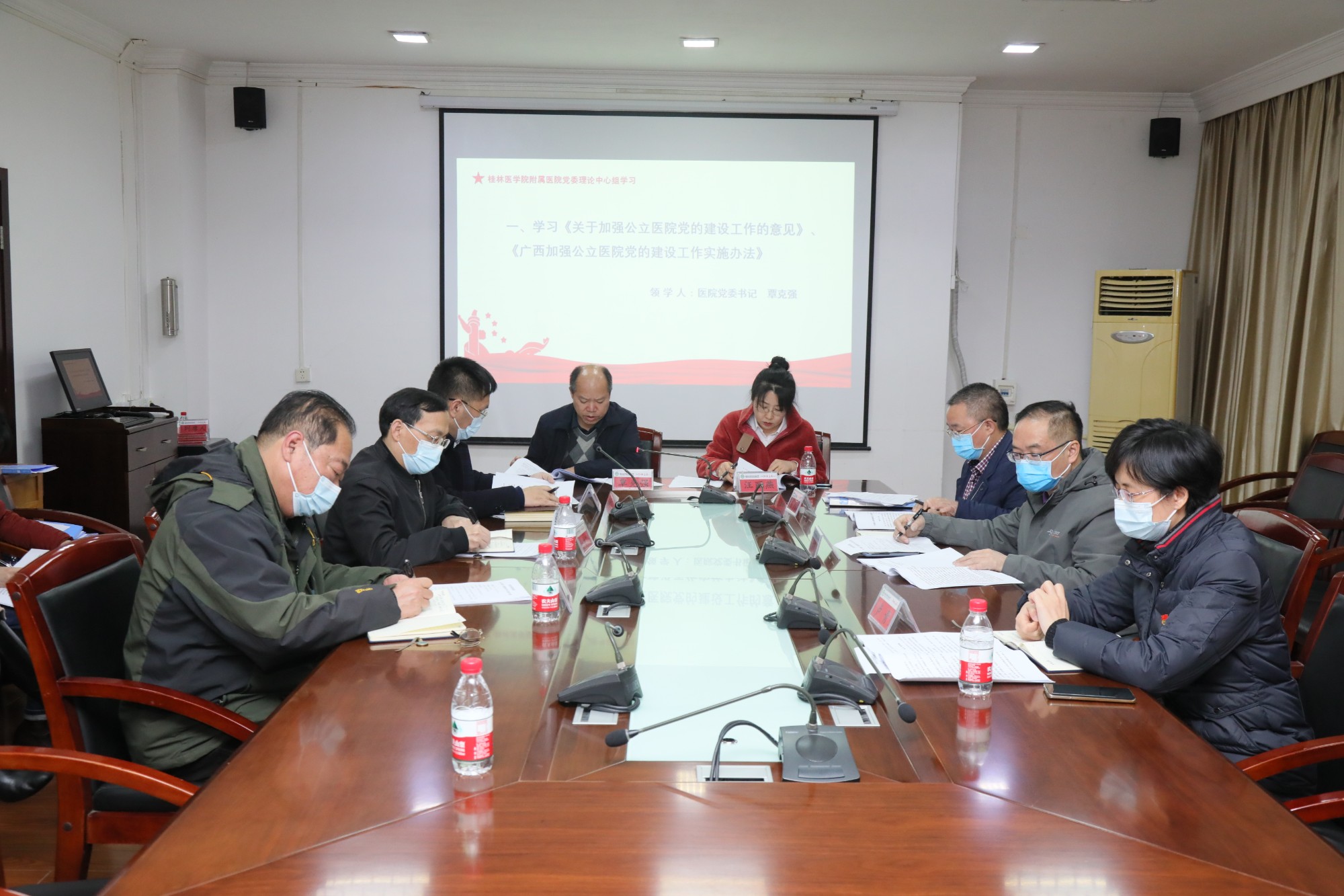 3月24日上午,附属医院在行政二楼会议室举行2022年第1次党委理论学习中心组(扩大)集体学习。会议重点传达学习中共中央办公厅《关于加强公立医院党的建设工作的意见》《广西加强公立医院党的建设工作实施办法》和2022年全国“两会精神”,围绕《中共广西壮族委员会关于大力推进清廉广西建设的意见》《习近平法治思想学习纲要》等内容,联系工作实际进行交流研讨。医院党政领导班子、党委委员和党口职能部门相关负责人参加会议,会议由党委书记覃克强主持。