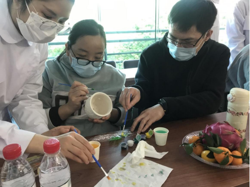 学生在孕妇学校指导孕妇及家属开展美学胎教