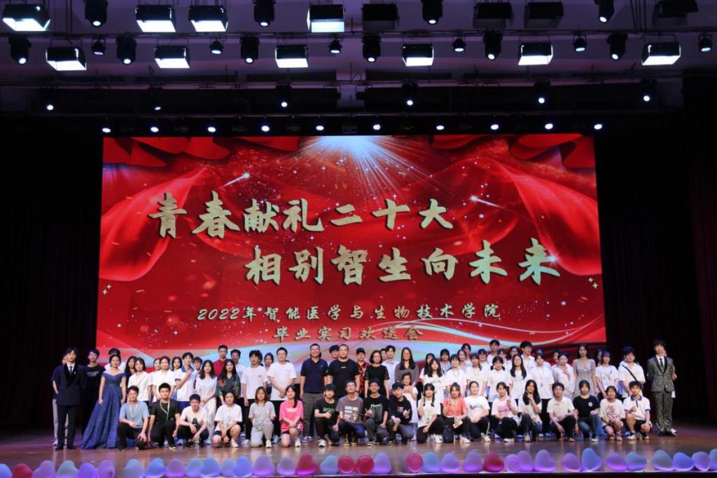青春献礼二十大相别智生向未来。为引导师生厚植爱国主义情怀,增强“永远跟党走”的理想信念,智能医学与生物技术学院于6月1日晚在大活四楼演艺厅举办了 “青春献礼二十大,相别智生向未来”文艺晚会暨2022届毕业实习欢送会。学院党政领导、学工办、教研室教师代表以及全体在校学生共同观看了晚会。