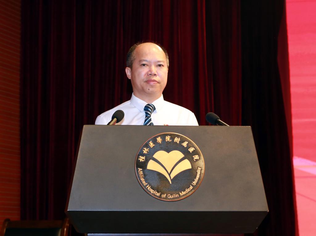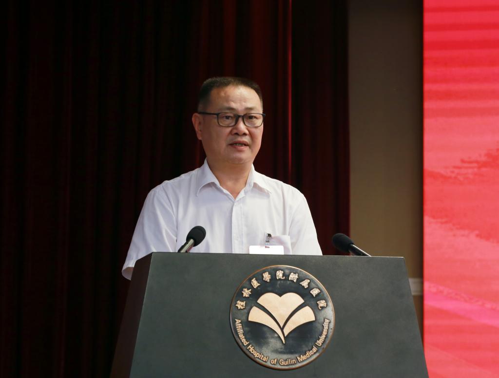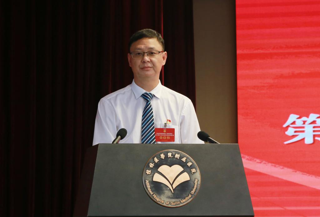 辛懋代表学校为大会致辞。他指出,近年来,新冠疫情不断反复,附属医院在做好常态化疫情防控工作的同时,积极响应号召参与各地各项疫情联防联控和救治工作,守护了人民健康,为抗疫工作做出了重大的贡献。今年是党的二十大召开之年,新形势、新任务给医院提出了新的要求,面对新的压力和挑战,大家应该齐心协力推进漓东新院区的建设,为医院建设和各项工作的开展贡献力量,为向桂林及周边省市的人民,以及国内外游客提供更精湛的医疗技术和更优质的医疗服务而努力奋斗。最后,他预祝大会取得圆满成功!