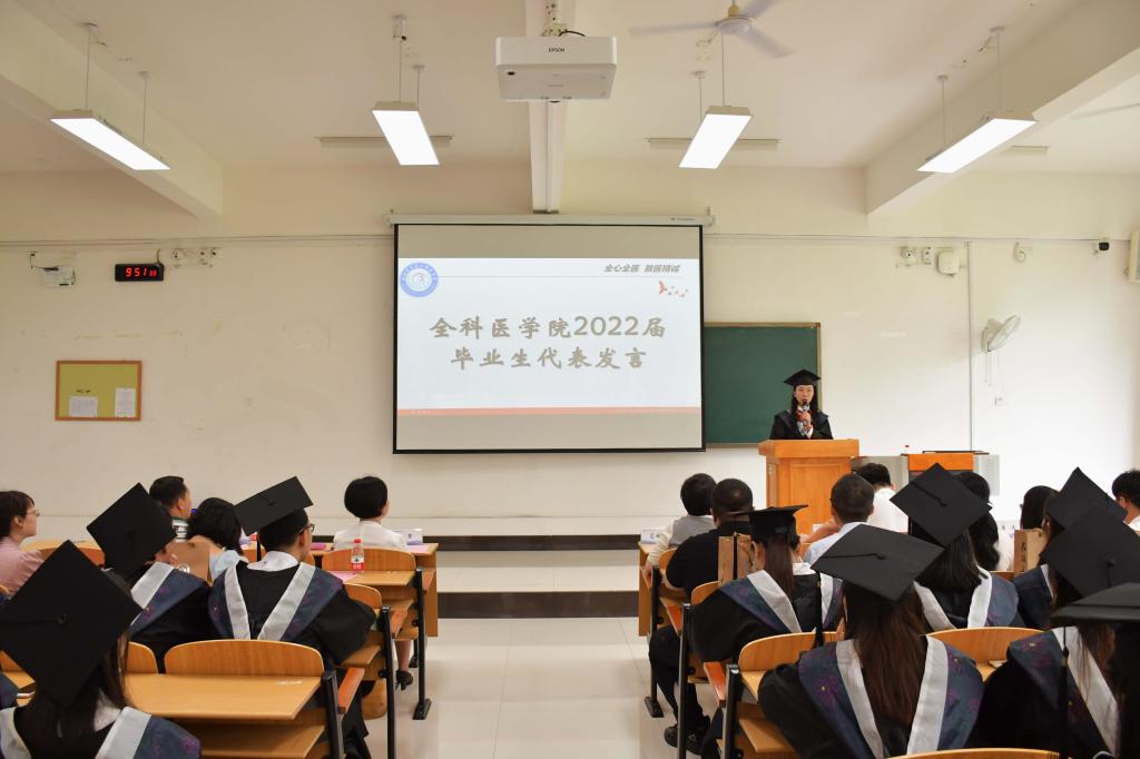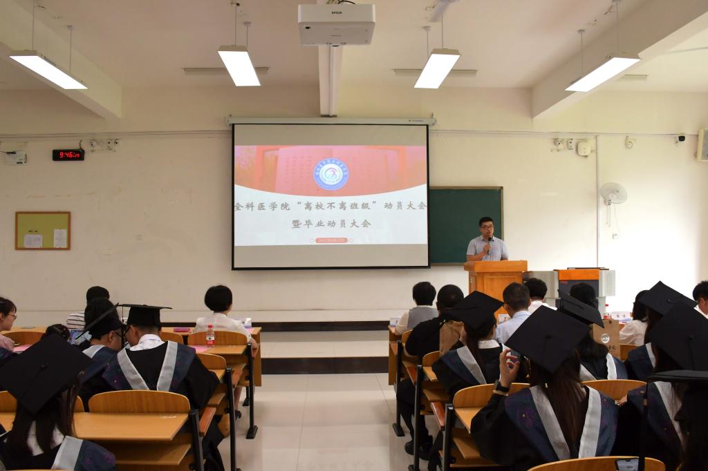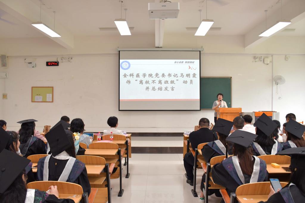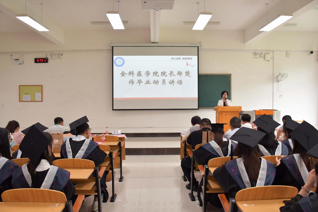 动员会上,首先观看由在校生为全科医学院2022届毕业生拍摄的祝福视频。随后,全科医学院2022届区优秀毕业生代表分享了在校期间的学习生活和成长感悟,她展望了对未来的规划与憧憬,并诚挚地表达了对母校、学院用心栽培的感谢。接着,全科医学院院长郑楚代表学院向所有毕业生表达了毕业祝福,并向同学们提出了几点建议和希望,她希望大家未来循序渐进,坚定初心,做个务实的理想主义者;要充满情怀,以高标准、严要求完成规范化培训,做个规范化医师;时刻牢记医学生誓言,坚持梦想,心存感恩,做个厚道的医学人。最后,全科医学院党委书记马明霞进行“离校不离班级”动员并总结发言,她首先祝贺全科医学院2022届114名毕业生顺利毕业,感谢同学们为学院发展所作出的贡献,并为同学们讲解本专业在国家发展及个人发展上的价值、职业发展前景和未来发展方向;最后她表示全科学子“离校不离班级”的理念是为了帮助毕业学子一次性通过执业医考试,希望同学们能够树立专业自信,努力培养自己成为一个优秀的医生,成为一名“下得去、用得上、留得住”的基层医疗人才。