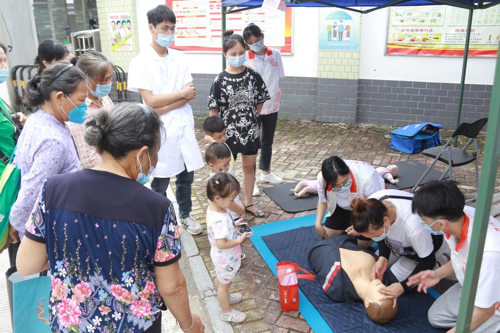 急救培训更是吸引了许多群众的关注,急救医疗培训队员们现场为群众们进行心肺复苏抢救培训、海姆立克急救法培训,详细讲解急救技术的操作要点及注意事项,并通过实操进行了同步演示,内容包括判断是否丧失意识、判断有无自主呼吸、判断有无脉搏、进行胸外心脏按压、清理口腔异物、开放气道、人工呼吸等操作要领的示范,受到了群众们广泛欢迎。