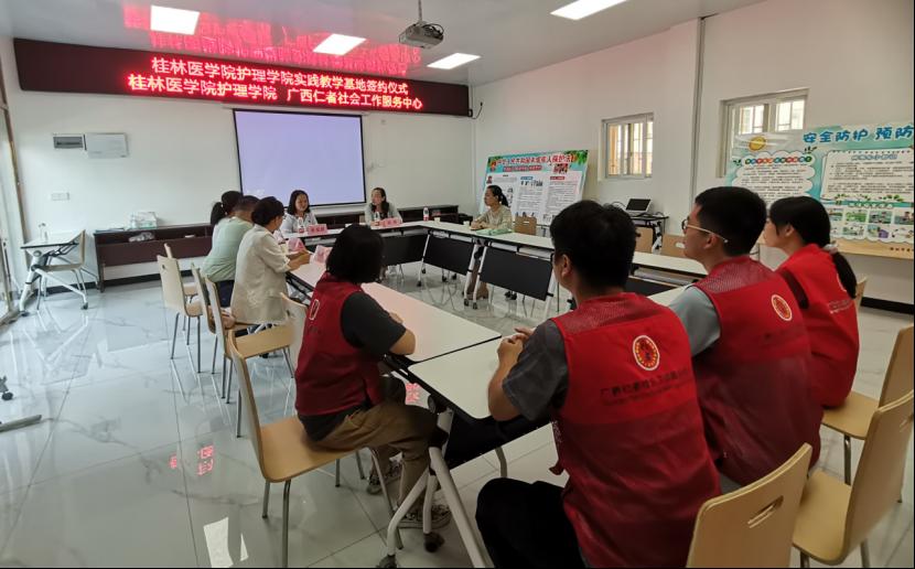 会上,高燕介绍了护理学院近年来社会实践类课程教学的基本情况和发展历程,并表达了通过课程传播健康观念,服务基层百姓的开课初衷。广西仁者社会工作服务中心负责人黄爱群讲解了中心的工作性质、工作内容和服务需求。双方均表示希望今后开展更多合作,以充分发挥高校服务社会功能。