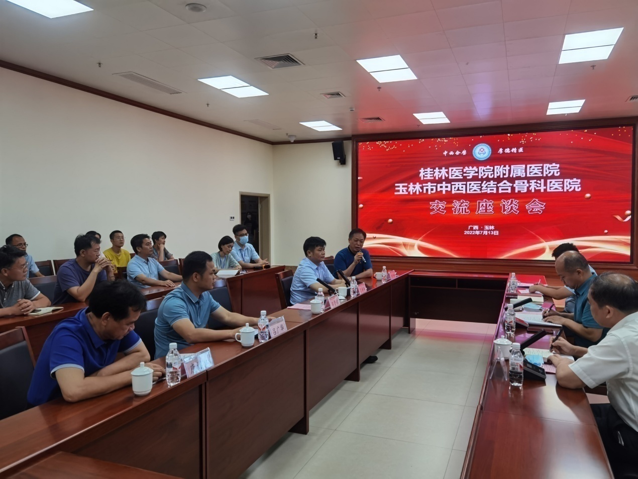 在玉林市中西医结合骨科医院,该院党委书记邹崇祺、院长梁博伟、党委副书记吕广华、副院长李开静、副院长唐继仁,以及党办院办、人事科、科教科等部门负责人,以及我校临床医学院毕业的职工代表等参加了座谈会。会上,邹崇祺介绍了医院的发展历程、基本情况,重点介绍医院党建的具体做法和廉政文化建设成果等。梁博伟重点介绍了医院的优势特色学科、产学研方面的成果、学科联盟建设等情况,并期望与桂医附院相关科室加强业务联系与学科建设交流,欢迎桂医优秀毕业生到该院工作。