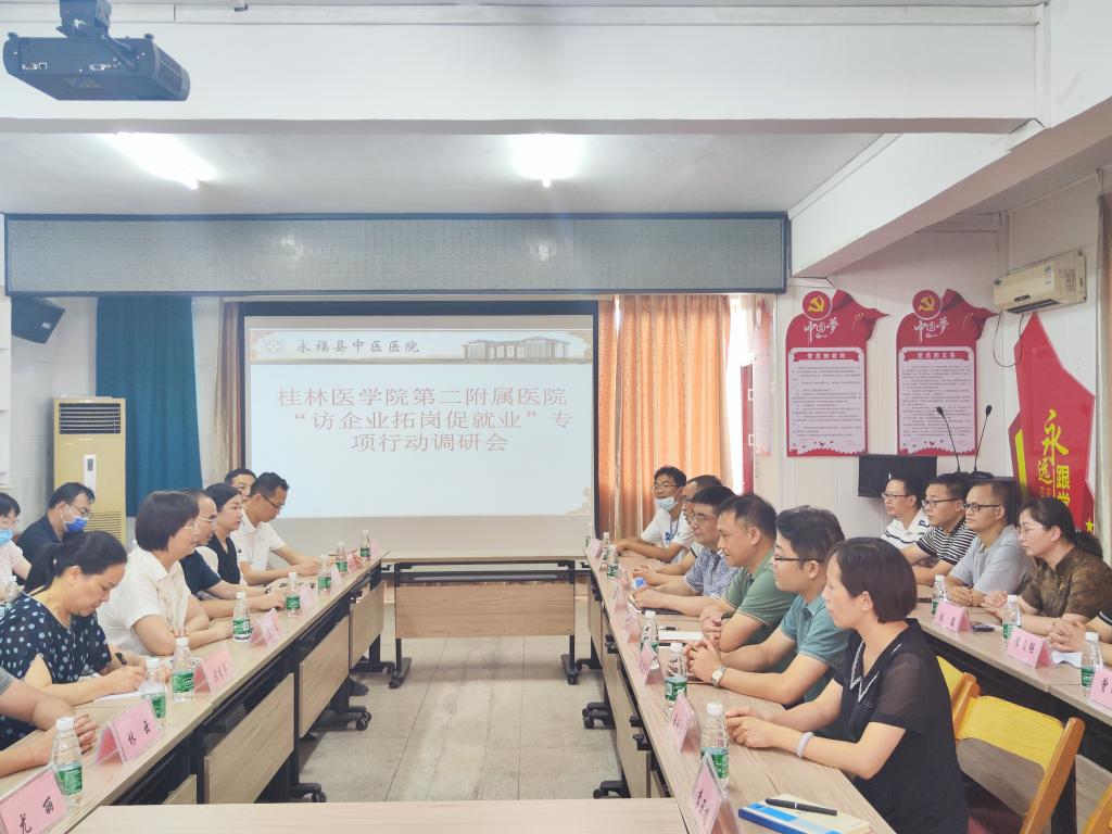 为贯彻落实党中央、国务院、自治区教育厅和学校关于高校毕业生就业工作的决策部署,进一步了解用人单位人才需求、人才招聘等方面情况,8月11日下午,第二附属医院(临桂临床医学院)赴永福县中医医院进行“访企拓岗促就业”专项行动调研会。第二附属医院(临桂临床医学院)院长莫碧文、副院长夏中华,永福县中医院党总支书记蒋庭谦及医院相关院领导、行政和临床科室人员参加此次调研会。