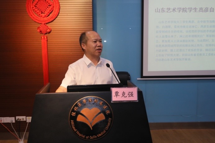 “教师和医护工作者都是受人尊敬的职业,在场的各位医生也是教师,要对本身的职业和从事的工作有足够的自信。”覃克强语重心长地开始了师德师风的授课。