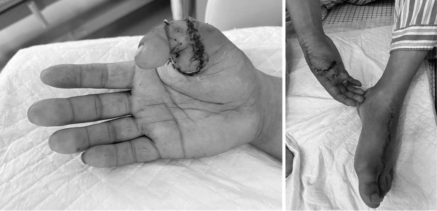 患者既往已行皮瓣转移手术,由于疤痕粘连和血管缺失等不确定因素导致再次手术风险极大。经术前周密的准备工作后,分2个显微手术组,分别处理供区和受区的血管,神经,和肌腱后,切取左足第二趾再造右拇指,大大地缩短手术时间。