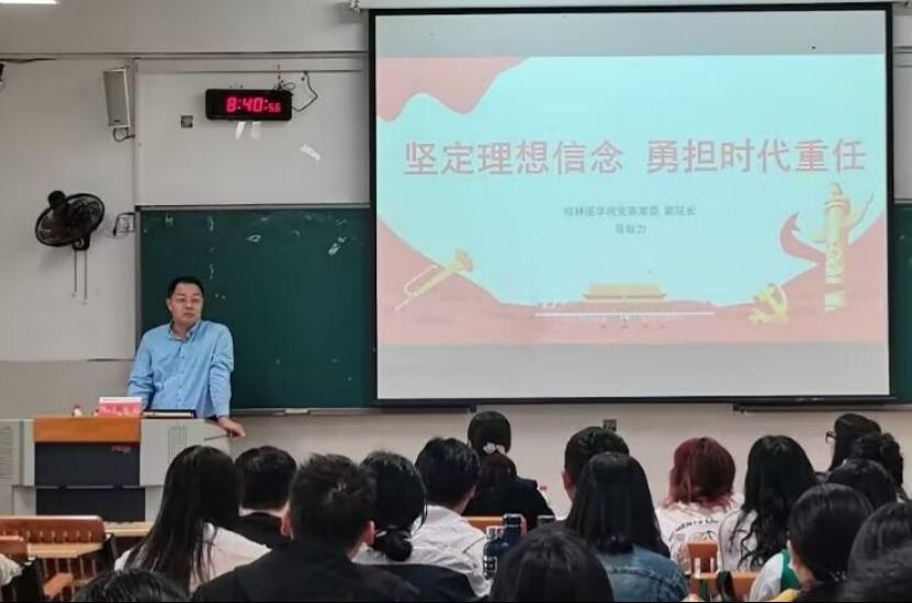 马献力以“坚定理想信念,勇担时代重任”为题,围绕中国共产党第二十次全国代表大会精神及习近平总书记对青年的殷切期望展开学习。他旁征博引、理论联系实际,结合个人自身的成长经历,通过重温历史故事、解读文化典籍、讲述新时代楷模和身边榜样的先进事迹对青年的历史地位和时代使命、新时代青年的奋斗目标做了深入阐释,勉励桂医青年学生要坚定共产主义理想信念,增强本领能力,坚持知行合一,成为勇挑重担、奋发有为的新时代青年。课程在一首节奏明快、昂扬向上的歌曲《少年》的优美旋律中结束。
