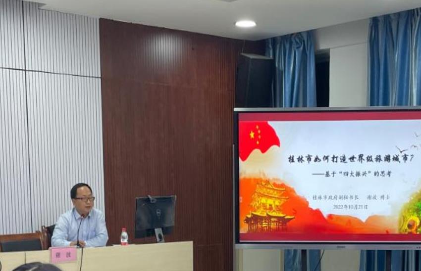 谢波以桂林市经济社会发展概况作为开篇进行讲解,讲述了过去五年桂林市在经济、社会、文化、生态等方面取得的成就,客观分析了桂林市经济社会发展面临的机遇与挑战。同时,谢波回顾了习近平总书记视察广西和桂林时的重要讲话和重要指示精神,结合党的二十大精神,通过案例分析,重点围绕如何推动“四大振兴”,加快将桂林市打造成为世界级旅游城市的主题,对桂林市未来经济、社会、生态等方面的发展提出了一系列建议措施,以期全面加快推进桂林“打造世界级旅游城市”的步伐。