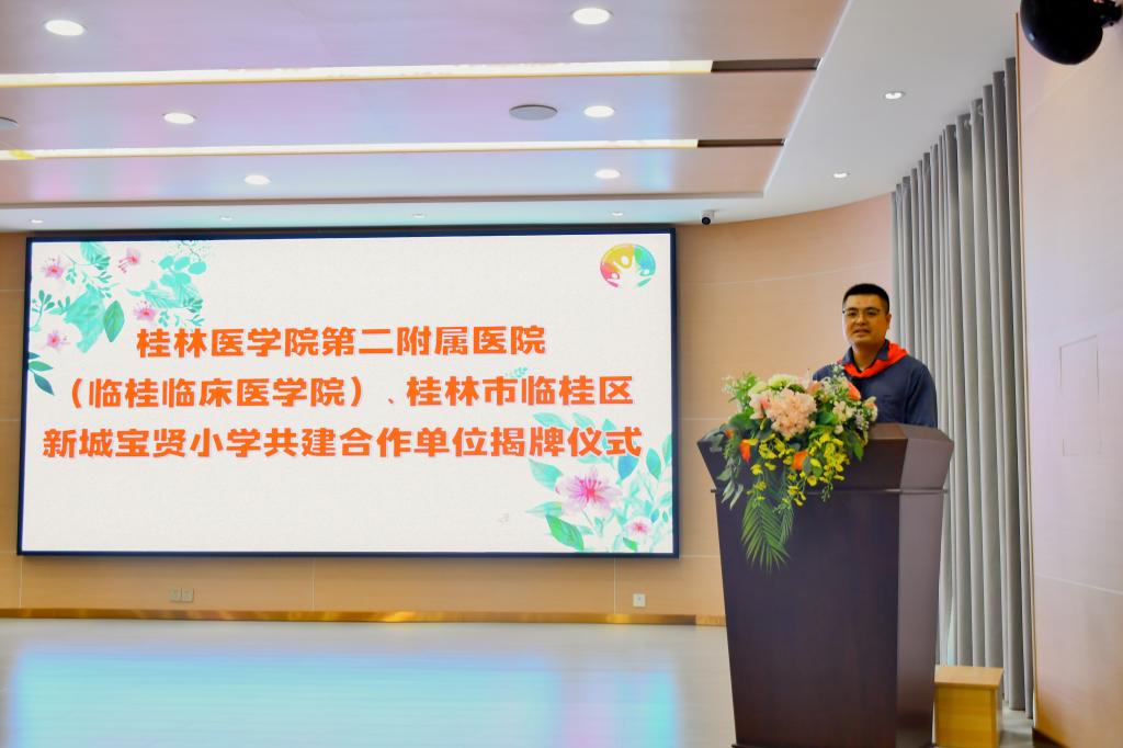 为了学习贯彻党的二十大精神,深入开展“三全育人”综合改革工作,让更多的医学知识、健康宣讲服务于青少年儿童,11月7日14︰30,桂林医学院第二附属医院(临桂临床医学院)、桂林市临桂区新城宝贤小学在小学报告厅举行共建合作单位揭牌仪式。桂林医学院第二附属医院(临桂临床医学院)党委副书记黄宇平、桂林市临桂区新城宝贤小学校长陈慧凤出席此次活动。