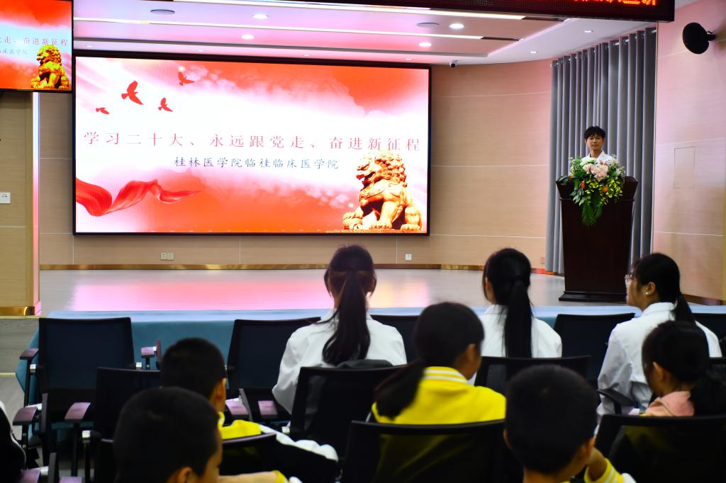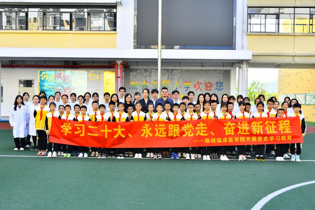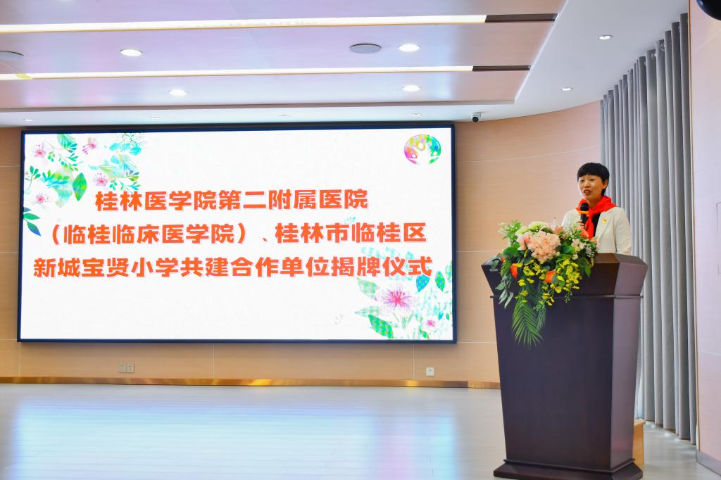 少先队员们为与会嘉宾佩戴红领巾,欢迎他们的到来。黄宇平致开幕词。他提出,第二附属医院(临桂临床医学院)将持续到新城宝贤小学开展医学知识宣讲活动,锐意进取、担当作为,汇聚推进“健康中国”前行的强大力量,为全面建成社会主义现代化强国、实现第二个百年奋斗目标筑牢健康之基。随后,陈慧凤发言。她指出,希望通过院校之间的合作,充分利用教育资源,开展医学科普活动、健康知识宣传活动,引导孩子们学习科学知识,大胆实践探索,了解生命成长的秘密,感受医学的魅力。接下来,双方举行桂林医学院第二附属医院(临桂临床医学院)“三全育人”技能培训基地、临桂临床医学院菁华志愿服务团、菁华急救宣讲团医学知识教育基地的揭牌仪式。