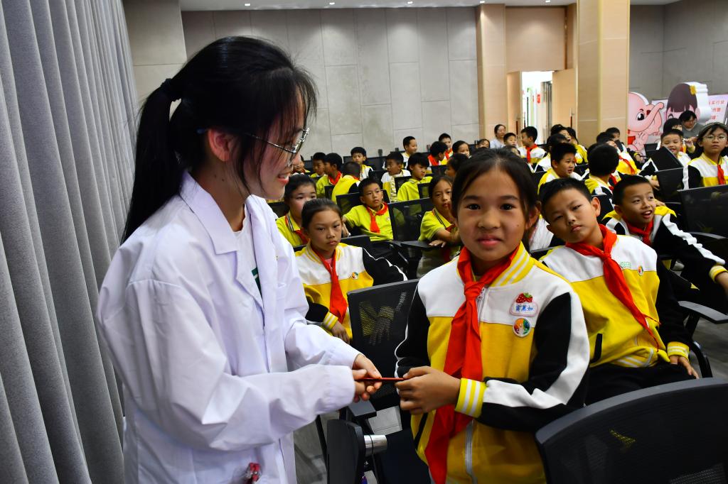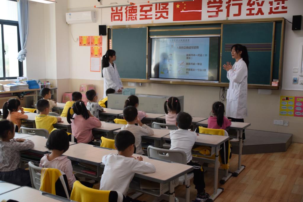 揭牌仪式结束后,医学生志愿者分为20组进到各个班级给小学生授课。首先,医学生们开展以党的二十大精神“青年说”为主题的党的二十大报告领读活动,引导小学生学习党史知识,努力成长为德智体美劳全面发展的社会主义建设者和接班人。随后,医学生们在高年级班级开展以“迎接青春期,携手共成长”为主题的医学知识宣讲活动,聚焦同学们青春期遇到的烦恼和困扰,有针对性地提供帮助和指导。在中低年级班级,医学生们开展以“关注普遍眼健康,共筑‘睛’彩大健康”为主题的医学知识宣讲活动,普及爱眼护眼知识,并带领小学生跟随眼保健操的音乐进行实际练习。互动环节中,小学生们踊跃举手回答问题,在欢乐的气氛中巩固了健康知识。
