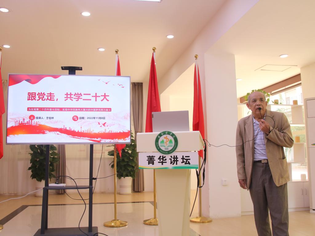 退休党员于佐林介绍了党的二十大召开时间、召开地点等基本知识,强调二十大是党和国家政治生活中的一件大事,是一次具有里程碑意义的会议。他结合个人对二十大的感受,与同学们分享小儿外科张金哲院士、麻风病防治专家李桓英以及眼疾专家张效房的党员医者事迹,教导青年学子学好知识、实事求是、敬畏生命且始终满怀学习热情,成为一名合格的医者。其谆谆教诲,满含对未来医学生、医务工作者的殷切期望。