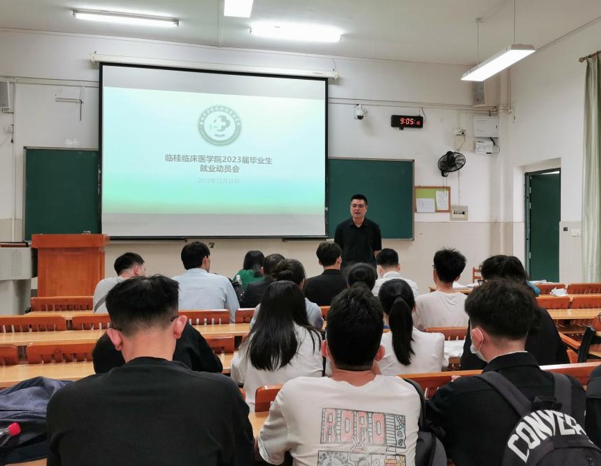 为进一步做好2023届毕业生就业指导工作,临桂临床医学院于11月12日上午9:00在临桂校区教学南楼S310举办2023届毕业生就业动员会。第二附属医院(临桂临床医学院)党委副书记黄宇平、学院学工办主任、毕业班辅导员以及2023届部分毕业生参加此次会议。