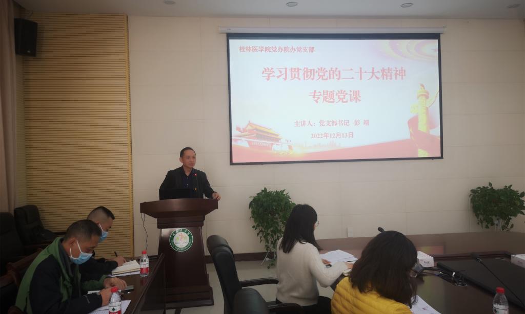 分享会上,党支部书记彭靖上“学习贯彻党的二十大精神”专题党课。他聚焦党的二十大报告中的数字化表达,利用PPT图文并茂的形式,对“党的二十大的重大意义及主要成果”“新时代十年的伟大变革及其里程碑意义”“学习贯彻党的二十大精神的五个牢牢把握要求”“教育科技人才支撑、法治保障、国家安全3方面重点工作”等内容进行了解读,并就如何学习好、宣传好、贯彻好党的二十大精神提出了工作要求。党课还专门安排了《中国共产党章程(修正案)》学习内容,他要求全体党员要深刻领悟党章修正案核心要义,确保党章要求具体而生动地落到办公室各项工作实处。