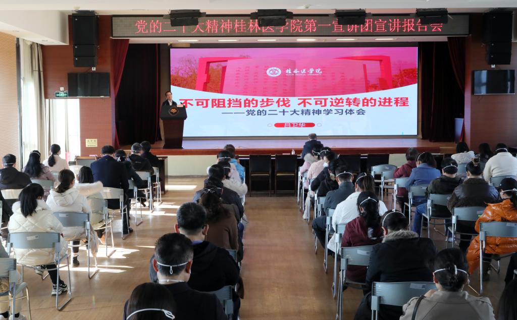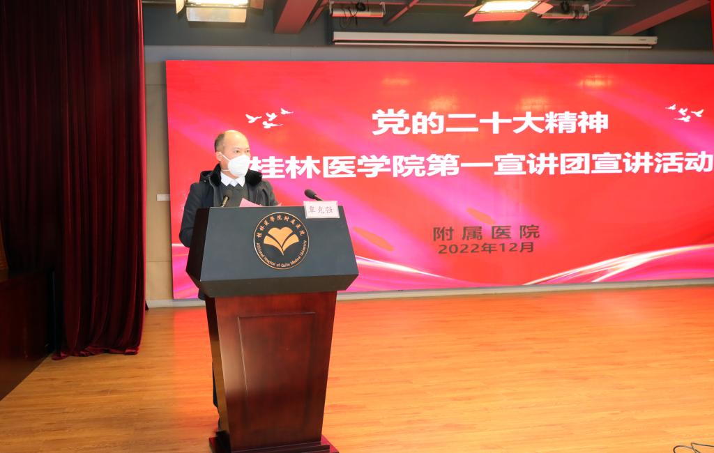 为深入学习宣传贯彻党的二十大精神,引导全院干部职工切实把思想和行动统一到党的二十大精神上来,把智慧和力量凝聚到党的二十大确定的各项任务上来,根据桂林医学院党委的安排,12月19日下午,桂林医学院干部专家宣讲团成员、马克思主义学院副院长(主持工作)吕卫华来到附属医院宣讲党的二十大精神。医院党委书记覃克强主持报告会。医院各科室负责人、护士长和行政党总支党员代表聆听了报告。