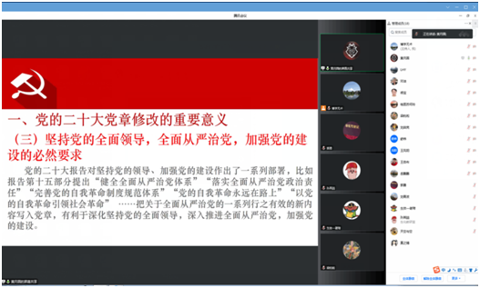 为深入学习宣传贯彻党的二十大精神,推动党员牢固树立党章意识,近日,智能医学与生物技术学院党委副书记黄月圆以“深入学习党章 增强党性修养”为题为学院教工第一党支部、教工第五党支部党员上党课。党课采取腾讯会议的形式,共有18名党员参加党课学习。