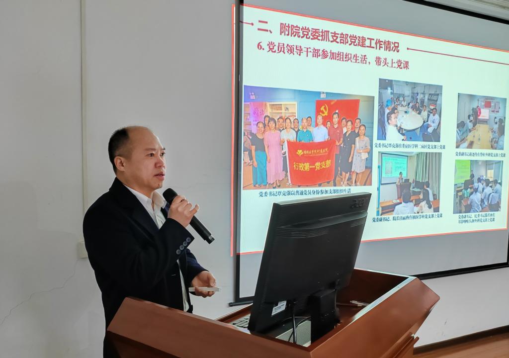 覃克强对医院党委基本概况、医院党委抓支部党建工作情况、医院星级党支部评定工作开展情况等方面进行汇报。他说,附属医院坚持以习近平新时代中国特色社会主义思想为指导,全面贯彻落实党的二十大精神,坚持全面从严治党,推动党对医院的全面领导向各党支部、各科室延伸,推动党的建设与医院中心工作、重点任务、日常工作有机统筹、深度融合。通过2022年度星级党支部的申报工作,医院党委对职工党支部党建工作的开展情况进行了一次全方位的摸底,明晰各支部党建工作现状,也为下一步党委对党建工作部署及基层党组织建设工作指明了方向。