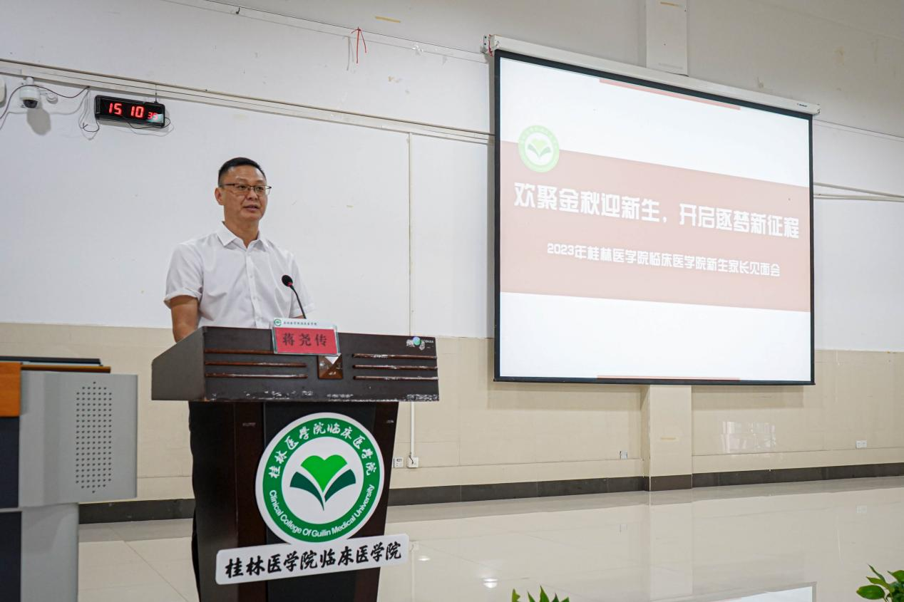 8月27日,临床医学院迎来了2023级新生。为了让新生及新生家长更好地了解学校,尽快地适应大学生活,从思想上引领新生角色转换,从行动上感恩父母的养育之恩。临床医学院举办“欢聚金秋迎新生,开启逐梦新征程”新生家长见面会。临床医学院党委书记覃克强、党委副书记蒋尧传,新生班级辅导员、班主任、班级导师,学工办全体辅导员、160余名新生及新生家长参加活动。活动由蒋尧传主持。