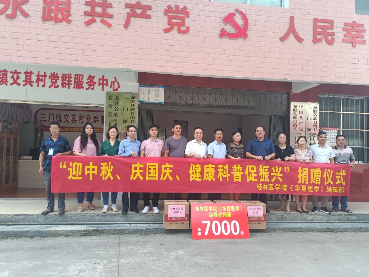 为喜迎中秋、国庆佳节,9月26日上午,桂林医学院《华夏医学》编辑部到龙胜各族自治县三门镇交其村开展“迎中秋、庆国庆、健康科普促振兴”活动。桂林医学院科技处、基础医学院、护理学院和附属医院的专家、学者,乡村振兴办、龙胜各族自治县三门镇交其村两委以及当地的村民参加了本次活动。