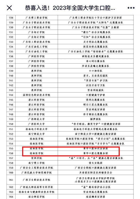 公告一经发出,全国范围内各高校志愿服务团队广泛关注并积极参与,最终主办单位评选出1000支大学生志愿服务团队。其中,桂林医学院第二附属医院口腔治疗中心、临桂临床医学院团委联合申报的2支队伍入选2023年全国大学生口腔健康志愿宣讲团,分别是菁华口腔宣讲团和菁华口腔志愿服务团。