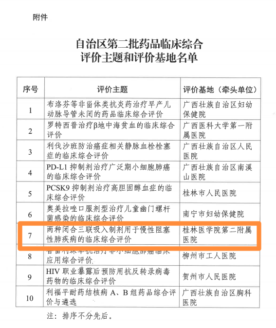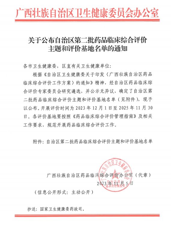 临床药品综合评价是根据《自治区卫生健康委关于印发<广西壮族自治区药品临床综合评价工作方案>的通知》精神,经自治区药品临床综合评价专家委员会研究遴选,确定了自治区第二批药品临床综合评价主题和评价基地名单。