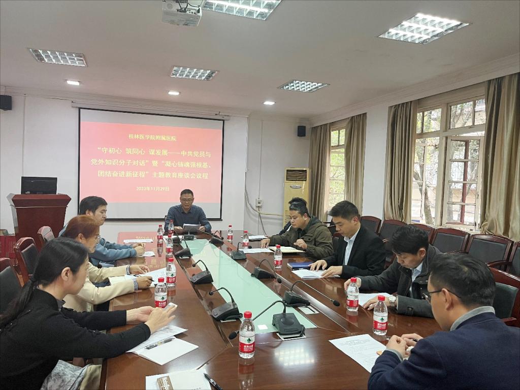 为深入学习贯彻习近平新时代中国特色社会主义思想,11月29日下午,附属医院举行了“守初心 筑同心 谋发展”中共党员与党外知识分子对话暨“凝心铸魂强根基,团结奋进新征程”座谈会。本次座谈会围绕思想引领、立德树人两个方面话题逐一展开,每个话题分别由两名中共党员和两名党外知识分子进行深入交流。医院党委副书记蒋尧传出席座谈会,统战部、组织科人员及中共党员、党外知识分子代表参加座谈。