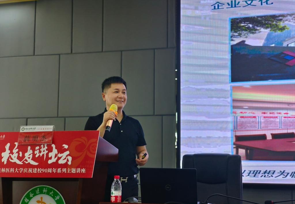 4月15日,由校团委主办、校学生会协办的“校友讲坛”——庆祝桂林医科大学建校90周年系列主题讲座第1期在临桂校区科学实验中心报告厅举行。我校2003级生物技术专业校友、励信集团董事长薛明杰先生受邀为师生作主题讲座。
