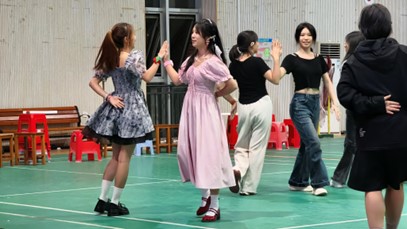 舞会在激昂的鼓点声中开场。学校醒狮队带来传统舞龙舞狮表演,瞬间点燃氛围。YY啦舞社、HDE街舞各自带来酣畅淋漓的舞蹈表演,尽显朝气蓬勃。随着华尔兹表演的优雅启幕,全场情绪达到顶峰,同学们纷纷步入舞池,共享华尔兹教学环节。大家主动邀请舞伴,自由组队共舞,在面具的“保护”下,克服羞涩,踏步旋转,舞池充满欢乐氛围。