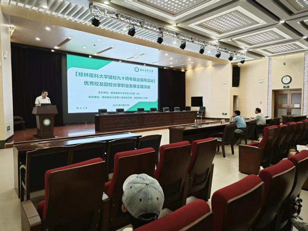 9月23日下午,“九秩杏坛·医者回响”——桂林医科大学九十周年校庆优秀校友回校分享职业发展主题活动在临桂校区教学北楼多功能报告厅举行。我校2000级临床医学专业毕业生、灵川县人民医院副院长唐志清受邀回母校分享职业发展历程。学校学生工作部(处)、第二临床医学院等相关部门负责人及300余名师生参加活动。
