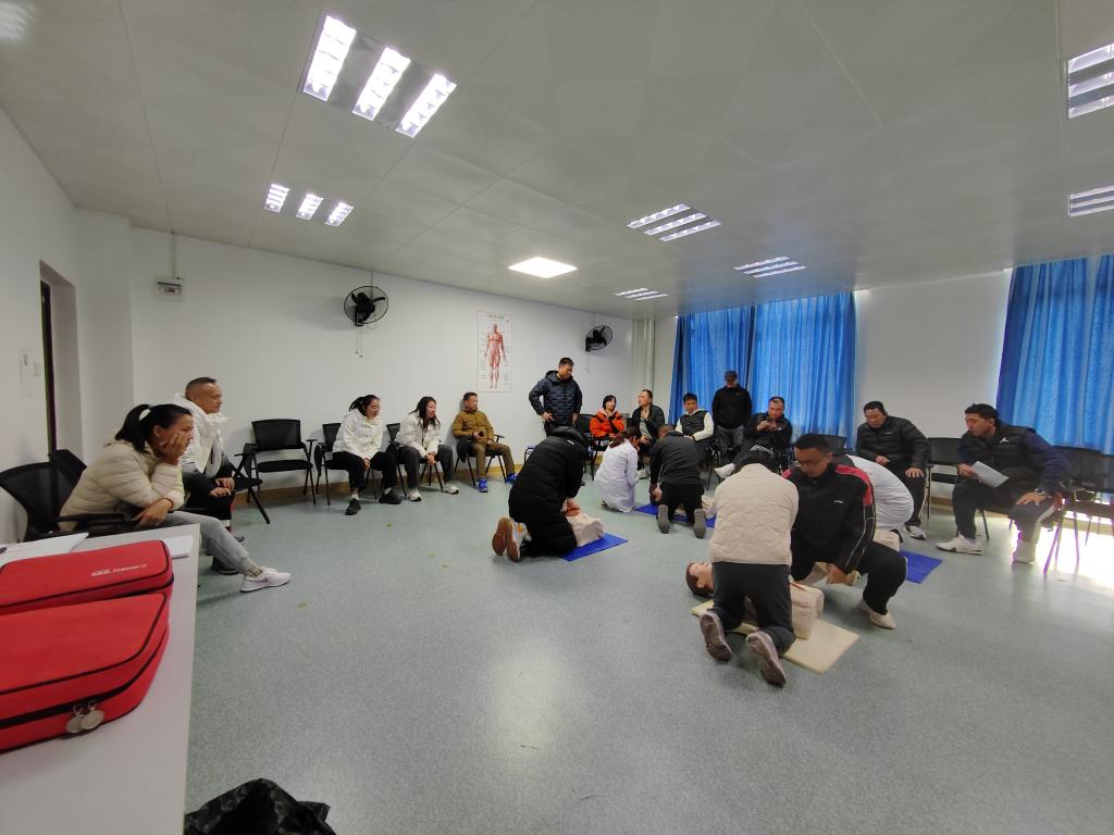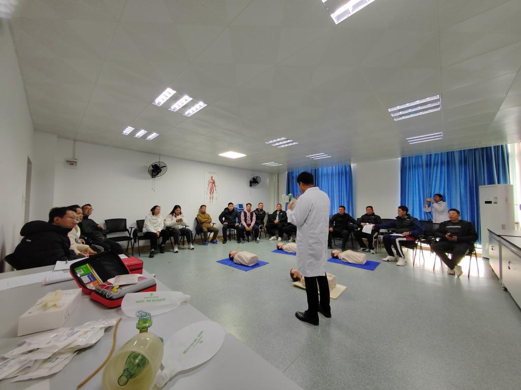 在现场,大家学习热情高涨,分组实操环节,认真练习,张杰医生和助理护士逐一纠正操作中的不规范动作,确保每位参训人员都能熟练掌握AED的使用方法和心肺复苏的正确姿势。