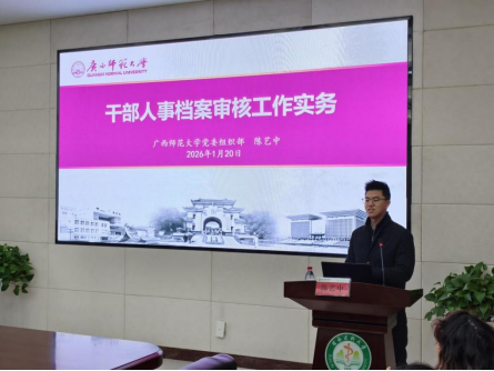为深入贯彻落实干部人事档案工作要求,进一步提升我校干部人事档案工作规范化、专业化水平,2026年1月20日下午,学校党委组织部在临桂校区明德楼502会议室组织开展了干部人事档案审查专题培训,广西师范大学党委组织部陈艺中老师应邀到校作专题辅导培训。校本部、各直属附属医院组织、人事、档案部门相关工作人员,以及各学院专职组织员和部分辅导员等参加了培训。培训会由学校党委组织部副部长秦丽凤主持。