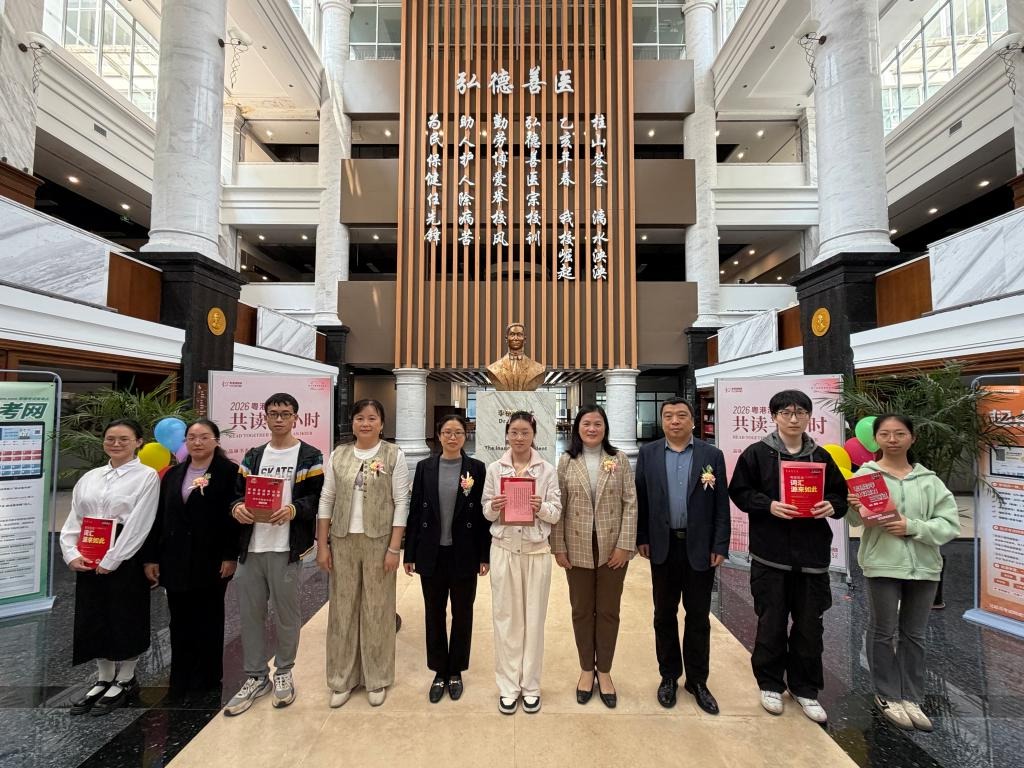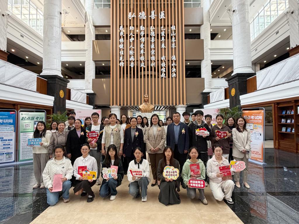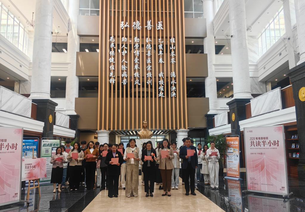 诗词朗诵《我的祖国》拉开活动序幕。学生们声情并茂地演绎传递家国之情与医者担当,让经典诗词焕发新的生机。“粤港澳桂琼共读半小时活动”中,师生们齐聚共读《我与地坛》节选篇章,同步参与这场跨越地域的阅读盛会,大家手持经典书籍,静心品读、沉浸思考,在跨地域的文化共鸣中,拓宽阅读视野、凝聚文化共识。赠书活动中,图书馆将考研书籍作为专属福利赠送给参与活动的学生,以书为礼、以读为乐,为本次读书日增添了浓厚的温情氛围。