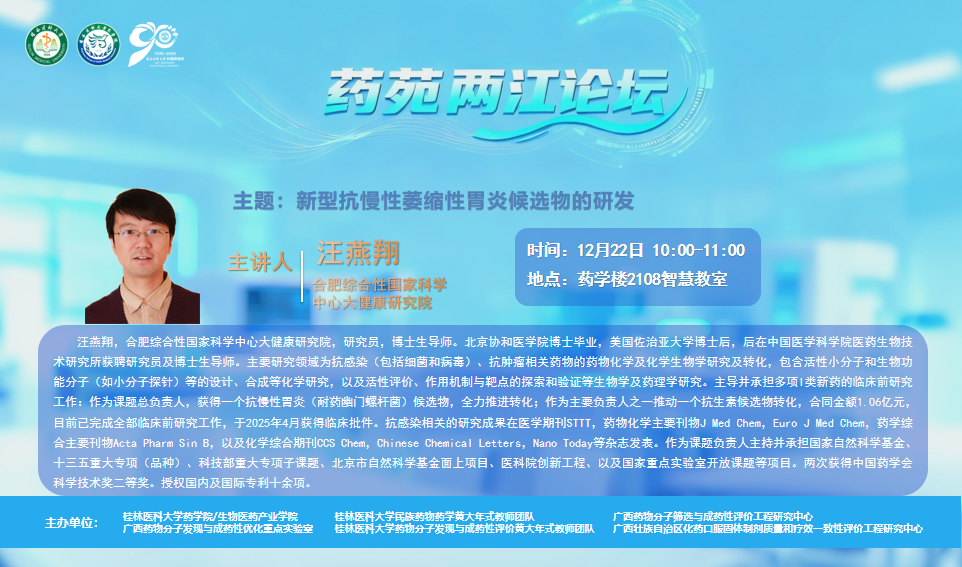 为促进药学领域学术交流、助力科研创新发展,搭建高水平学术研讨与科研合作平台,由桂林医科大学药学院、桂林医科大学生物医药产业学院联合主办的“药苑两江论坛”,定于2025年12月22日9:00—11:00在药学楼2108智慧教室举行。诚邀各位老师莅临现场,共话学术前沿,交流科研心得。具体会议安排如下: